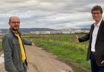Herzliche Einladung in das neue Gewerbegebiet. Der Vorsitzende des Gewerbevereins Jens Weber und Bür...